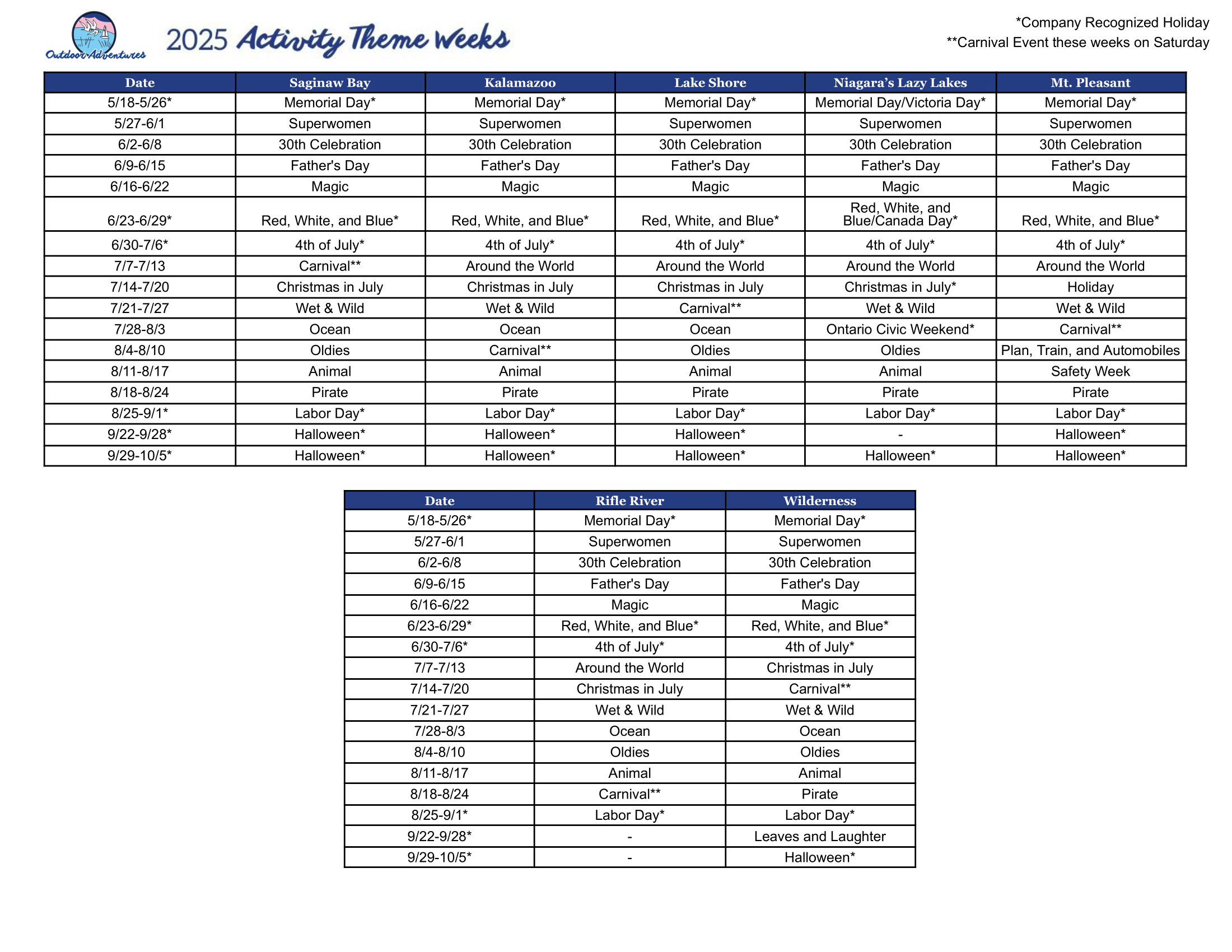 Mark your calendars and don’t miss out—these are the must-know theme weeks for 2025 at each Resort! This season, we’re making a change to better serve you! Monthly activity calendars will no longer be provided. Instead, all weekly activity information will be available at the Resort. This ensures you’ll always have the most accurate and up-to-date details about activities during your stay! Get ready to make memories, enjoy exciting events, and plan your next adventure!
