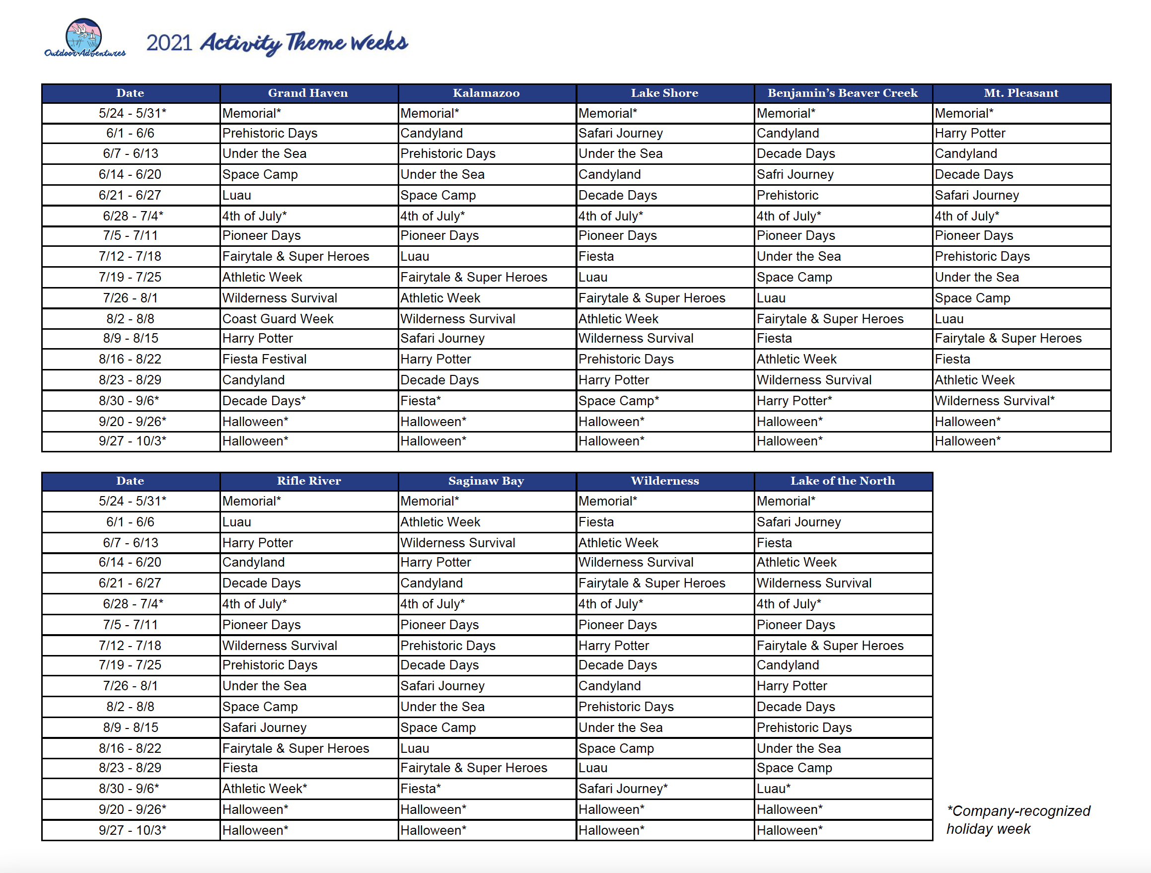 2021 Activity Schedule - Outdoor Adventures Resorts