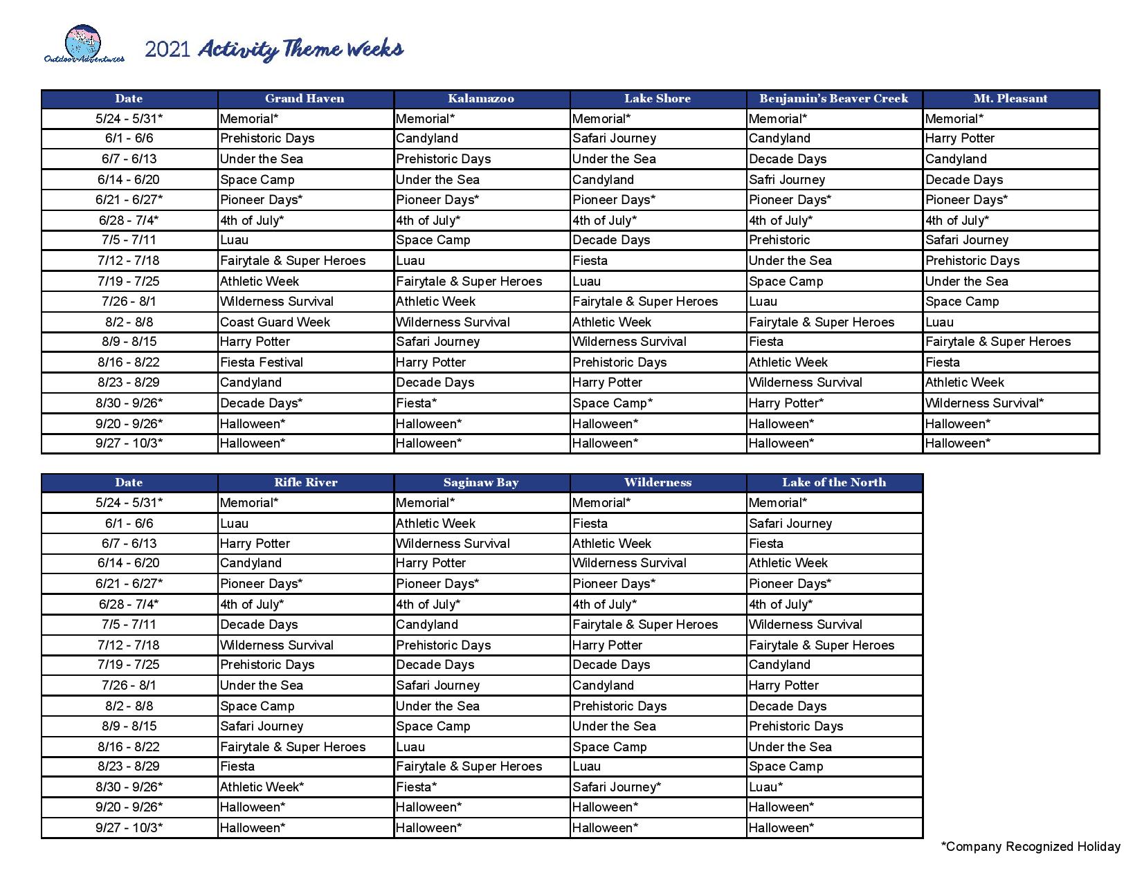 2021 Activity Theme Weeks - Outdoor Adventures Resorts