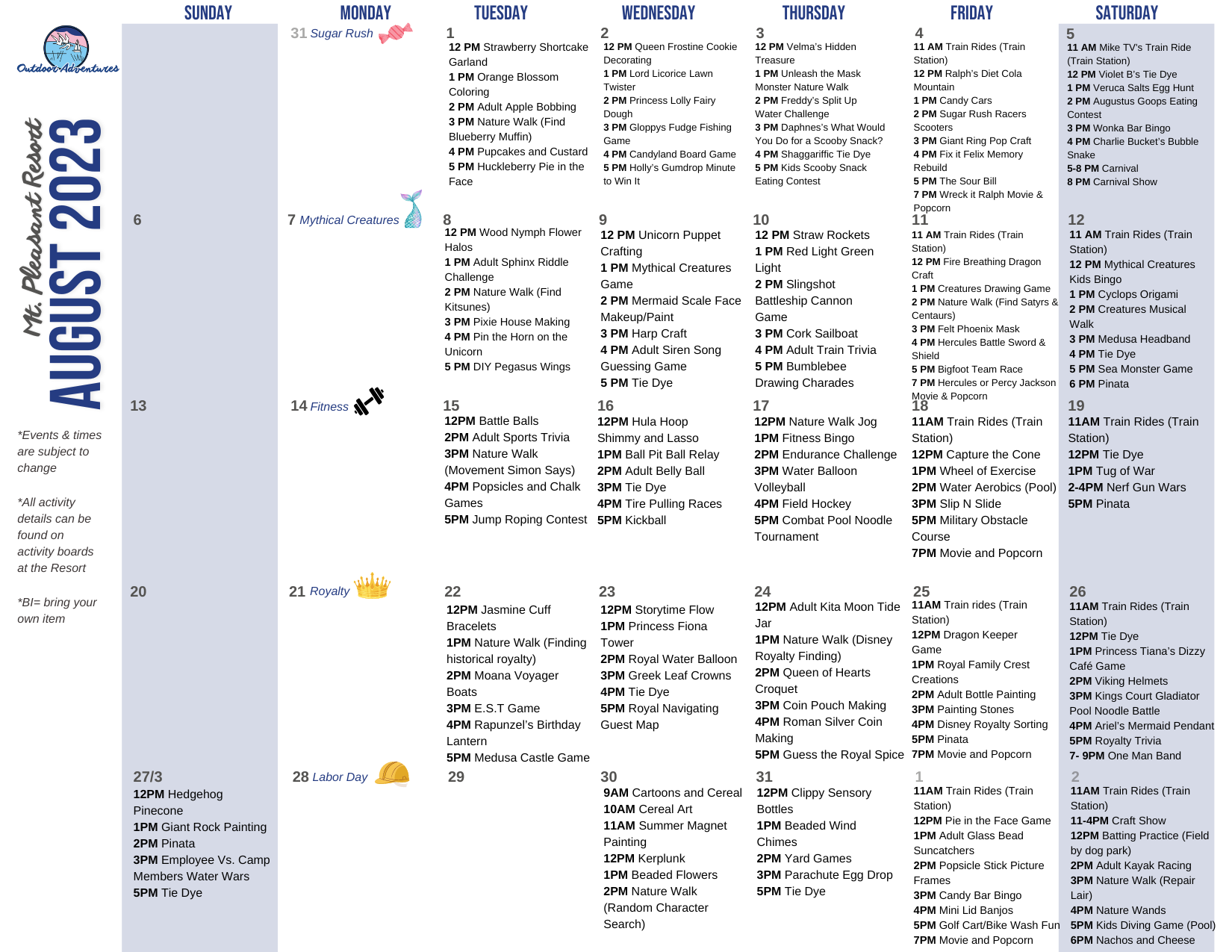 Mt. Pleasant Resort 2023 Activity Calendar_AugustUPDATED - Outdoor Adventures Resorts