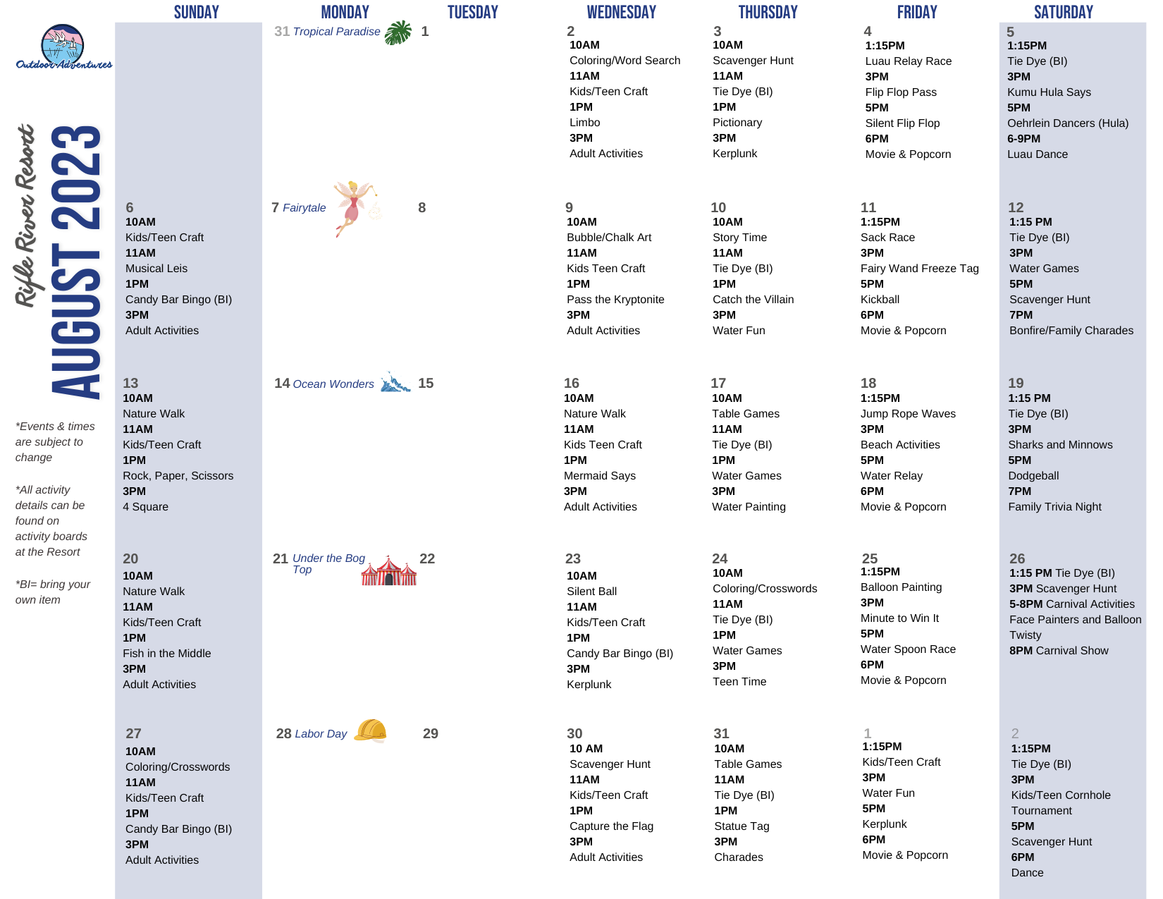 Rifle River Resort 2023 Activity Calendar_August - Outdoor Adventures Resorts